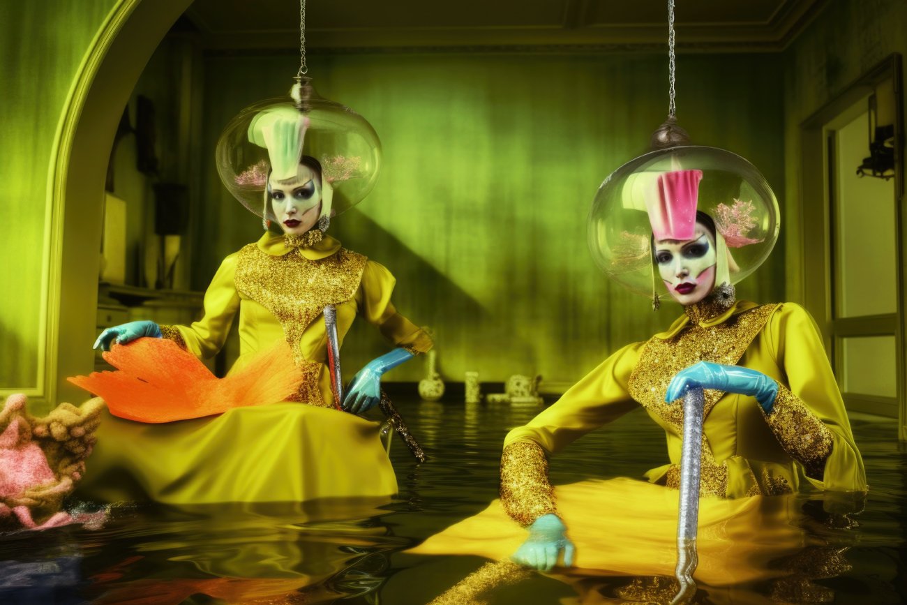 /imagine a future world affected by flooding brought about by climate change. In this series, I harness the power of artificial intelligence to shed light on the inconceivable notion of carrying on with normalcy amidst these unimaginable circumstances. I use my (younger) self as a model, envisioning an uncanny portrayal of a future life that defies reason.